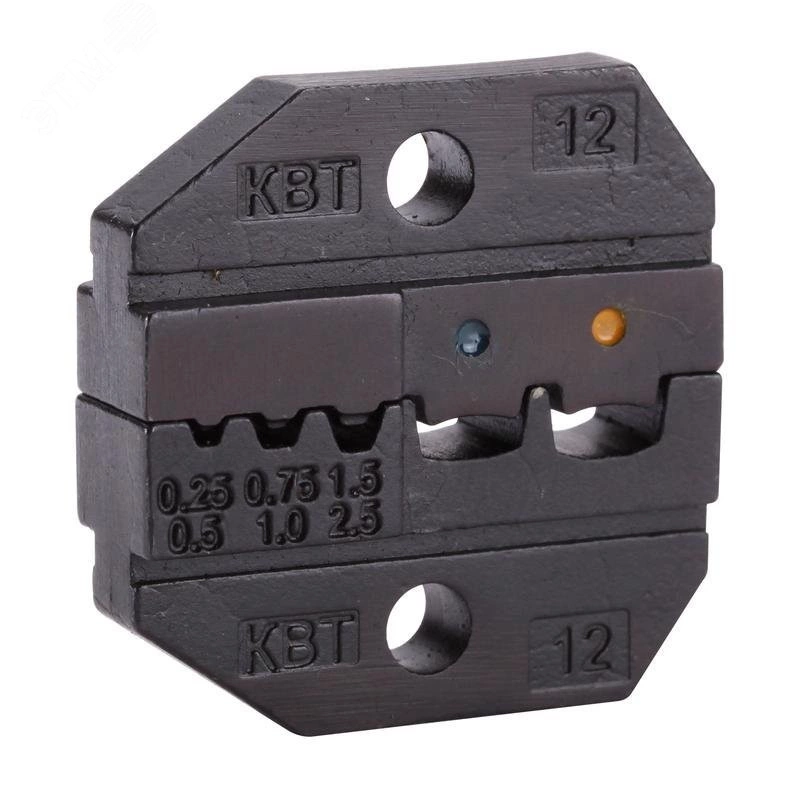 Используется совместно с пресс-клещами CTB-12, СТА-12, CTK-12. Применяется для опрессовки изолированных наконечников. Типы наконечников - НКИ, НВИ, НИК, НШКИ, НШПИ, ГСИ, НШВИ, НШВ, РПИ-П, РПИ-М, РППИ-М,РШИ-П, РШИ-М, РПИ-О. Сечения проводов - 0.25/0.34/0.5/0.75/1.0/1.5/2.5 мм?. Тип матрицы — пятипозиционная. Профиль обжима — трапециевидный и овальный, двухконтурный.