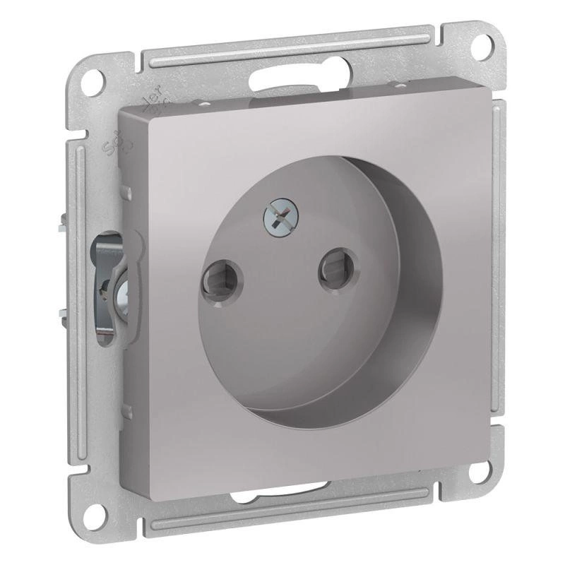 Механизм Schneider Electric AtlasDesign (цвет алюминий) розетки одинарной без заземления со шторками подходит для сетей 250 В, на ток 16 А.