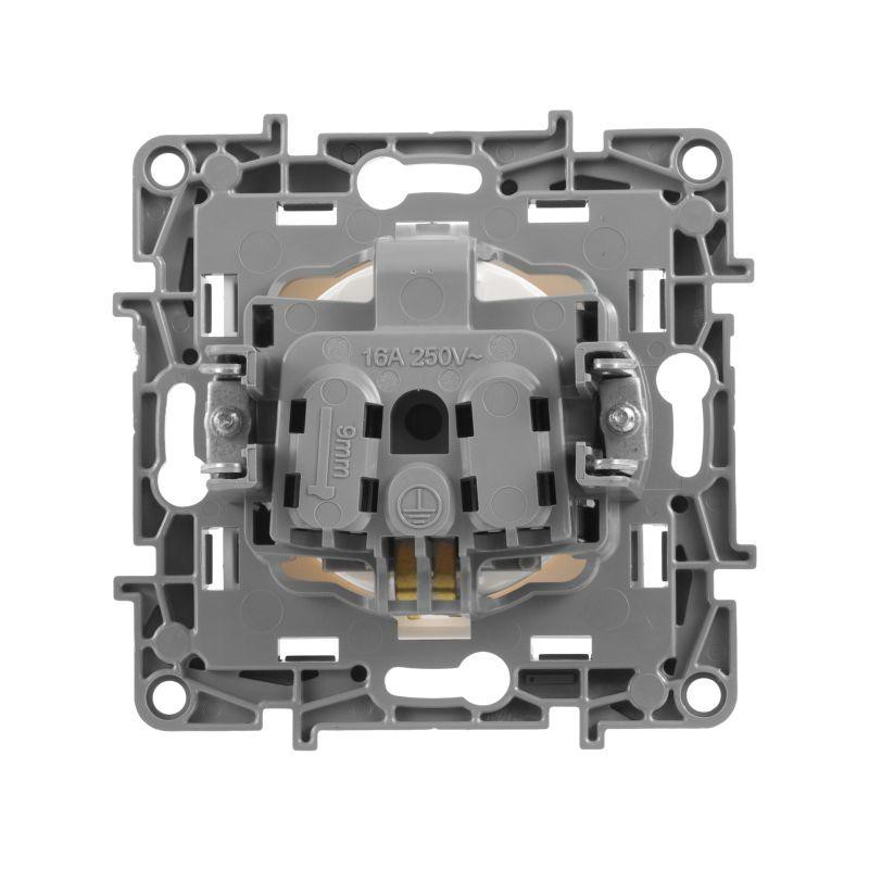 Представляет собой одноместный модуль розетки, со стороной 71 мм, с защитным контактом стандарта SCHUKO. Изготовлен из пластика, белого цвета, со шторками. Монтируется под штукатурку.