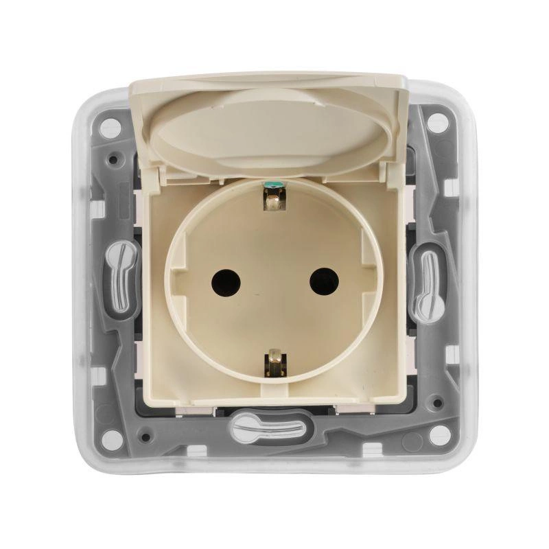 Механизм розетки 1-м СП Etika 16А IP44 2P+E с заземл. защ. шторки с крышкой немецк. стандарт безвинт. клеммы сл. кость Leg 672332