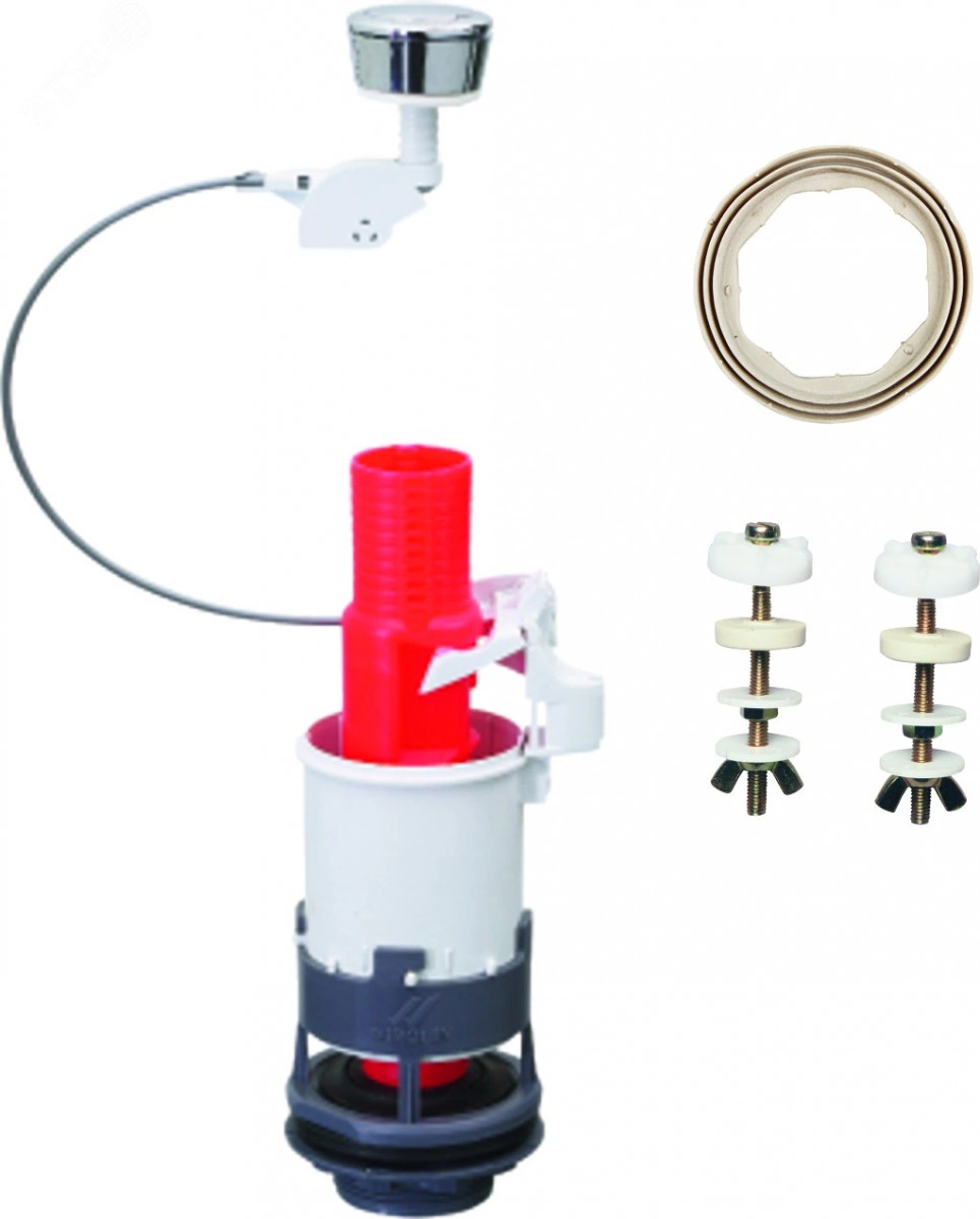 Сливной механизм Wirquin. Система механизма позволяет компенсировать расстояние между несцентрованными отверстиями крышки и бачка. Легкость установки не нуждается в регулировке. Механизм не держит крышку бачка что позволяет поднимать крышку без разборки механизма.