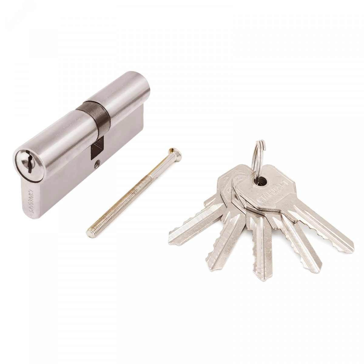Механизм цилиндровый для врезных замков. Европрофиль. Английский ключ. Материал цилиндра - цинковый сплав. Ключ-ключ. Выступающий на 30 градусов из плоскости механизма кулачок защищает цилиндр от выбивания из двери. Длина механизма - 80мм.