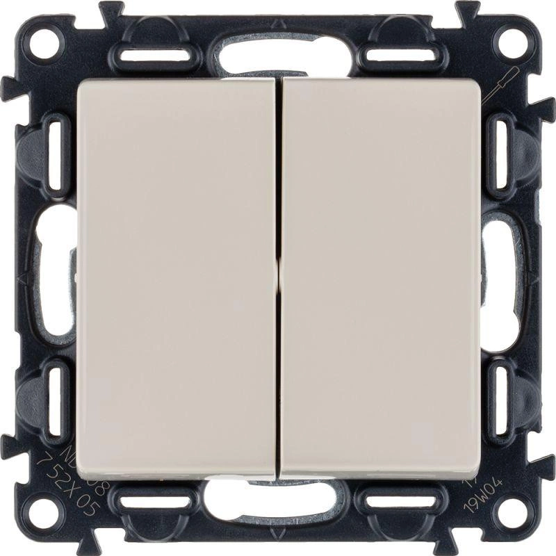 Представляет собой двуклавишный выключатель, из пластика, с лицевой панелью цвета слоновой кости, скрытой установки, монтируемый под штукатурку.