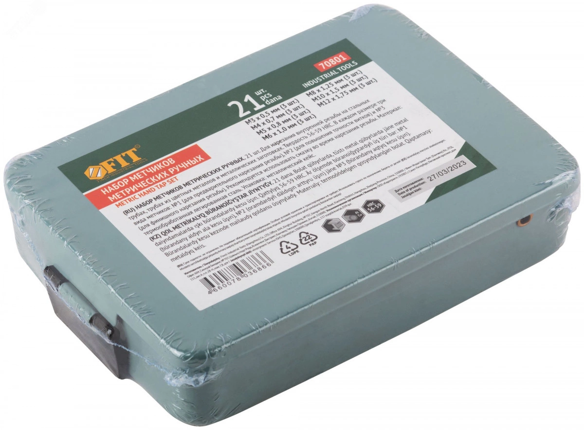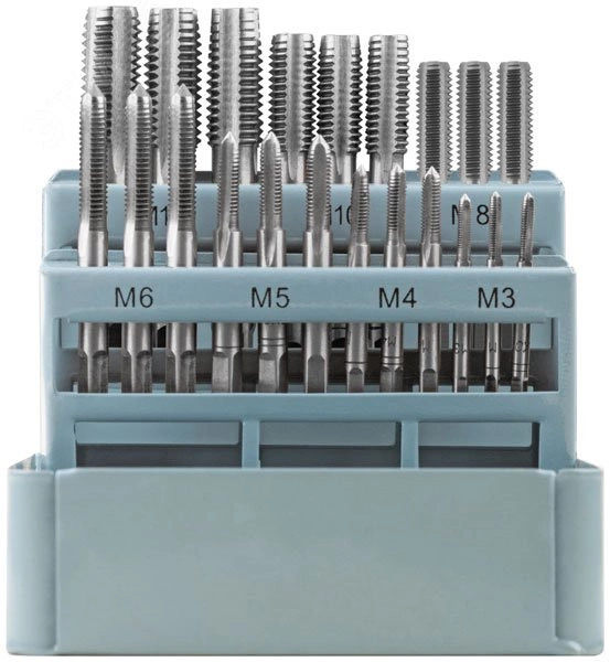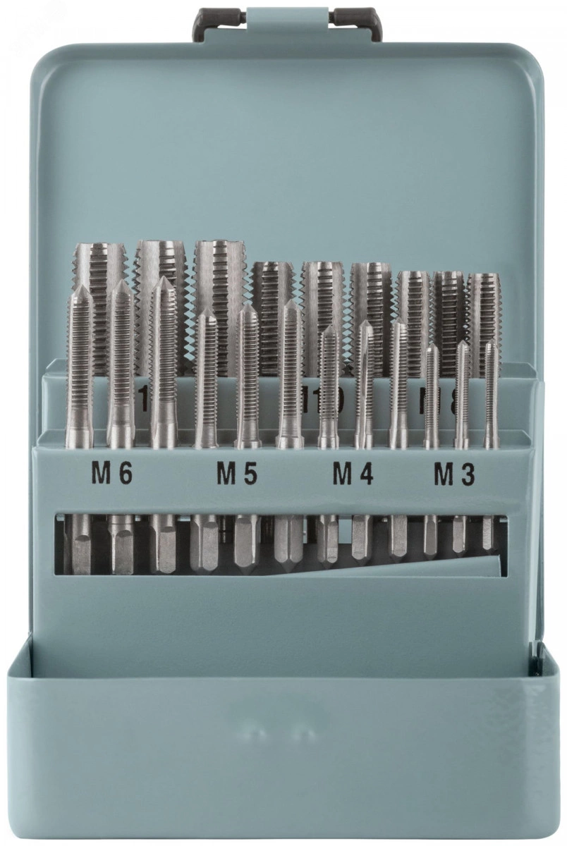 Для нарезания внутренней резьбы на стальных трубах, трубах из цветных металлов и металлических заготовках. В наборе: 21 метчик. Размеры: М3 x 0,5, М4 x 0,7, М5 x 0,8, М6 x 1,0, М8 x 1,25, М10 x 1,5, М12 x 1,75. В каждом размере три вида метчиков: №1 (для предварительного нарезания резьбы), №2 (для повышения точности витков) и №3 (для финишного нарезания резьбы). Материал: легированная инструментальная сталь. Упаковка: металлический кейс.