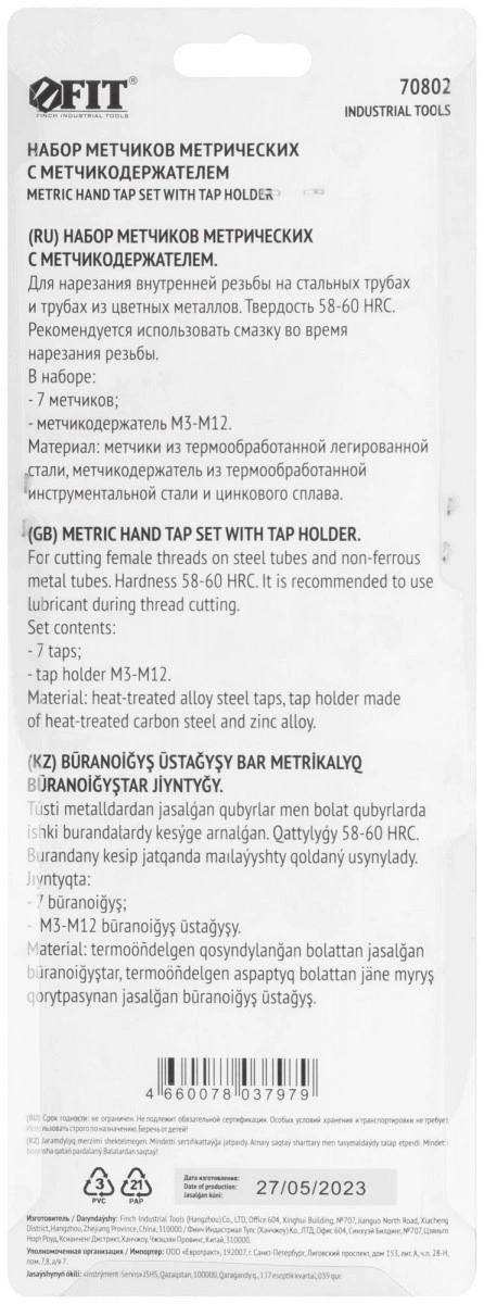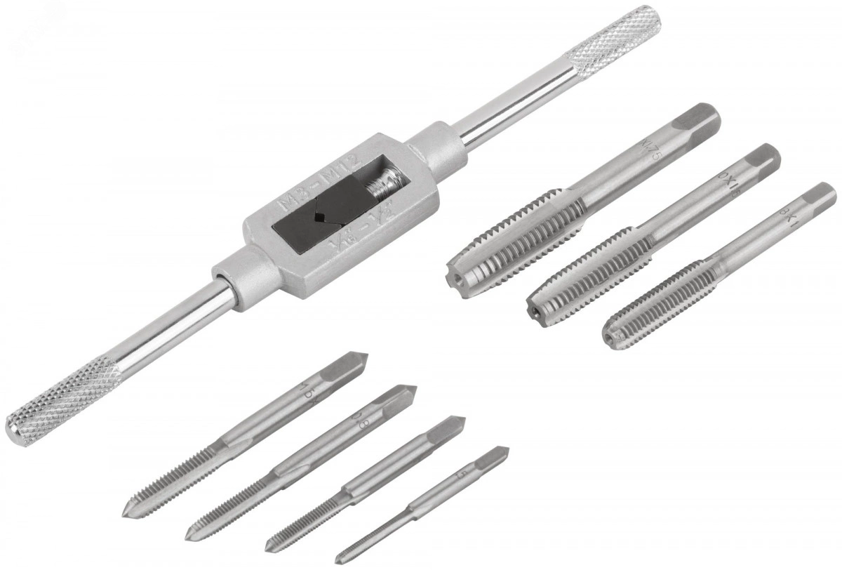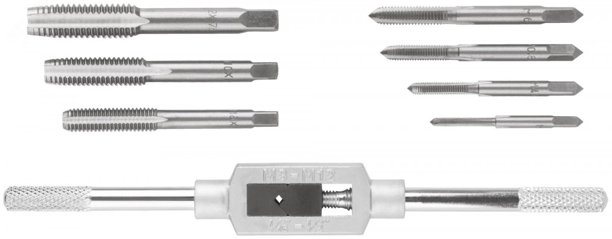 Для нарезания внутренней резьбы на стальных трубах и трубах из цветных металлов. В наборе: 7 метчиков. Размеры: М3 x 0,5, М4 x 0,7, М5 x 0,8, М6 x 1,0, М8 x 1,25, М10 x 1,5, М12 x 1,75, метчикодержатель М3-М12. Материал: метчики из легированной инструментальной стали, метчикодержатель из инструментальной стали и цинкового сплава. Упаковка: блистер.