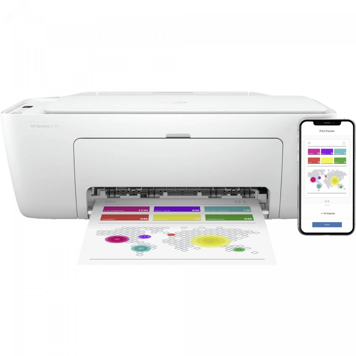 МФУ струйное HP DeskJet 2720 All-in-One &ndash, надежная модель для дома с функциями разных устройств. Ч/б документы и цветные фотографии печатаются на разных типах бумаги с плотностью 75 г/м. Удобно наличие функций копира и планшетного сканера, что упрощает работу с документами и учебными материалами. Прибор HP DeskJet 2720 All-in-One оснащен входным лотком на 60 листов и емкостью на 25 листов на выходе. Принтер идет в комплекте с двумя картриджами HP 305 для цветной и ч/б печати, ресурса которых хватает на 100-120 страниц. МФУ подключается к ПК по USB-порту, мобильным устройствам по Wi-Fi и Bluetooth. Имеется поддержка трех мобильных технологий печати.