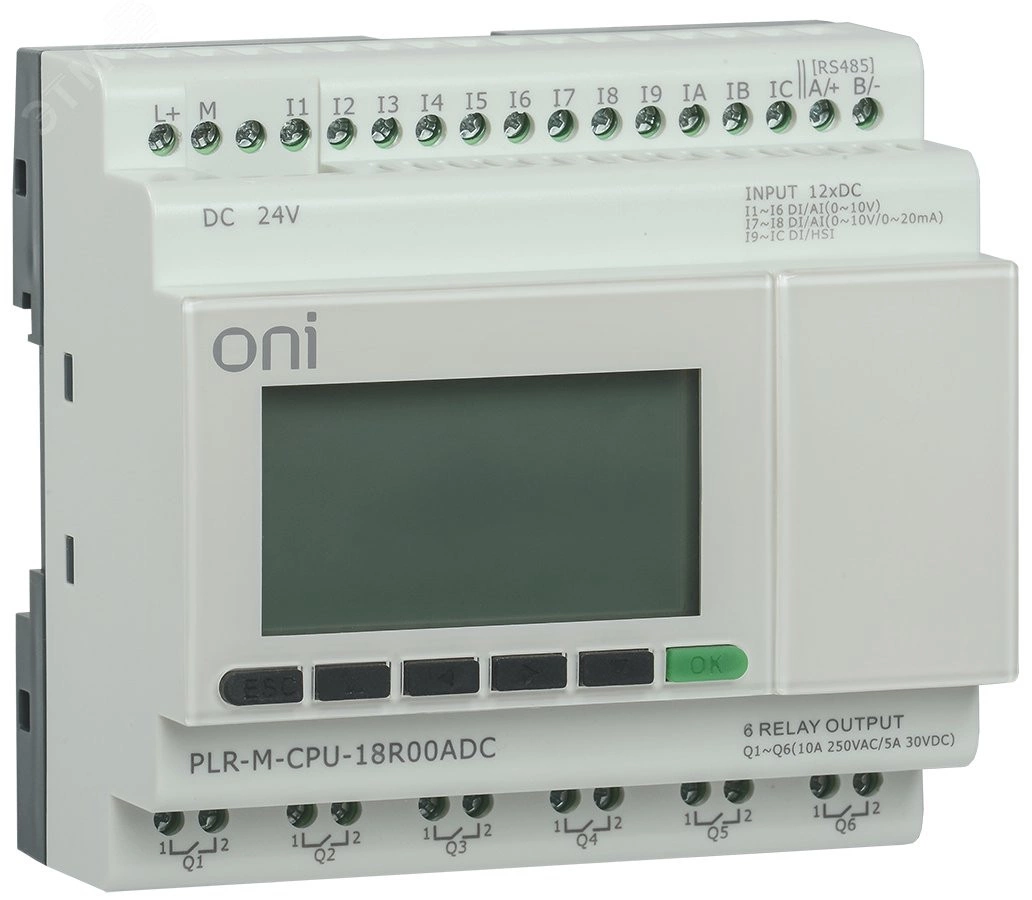 Модуль ЦПУ микро ПЛК ONI с возможностью расширения количества каналов ввода-вывода и коммуникаций с помощью модулей расширения ONI PLR-S. С интегрированным полнофункциональным экраном, 12 дискретными входами, 4 из которых можно использовать как аналоговые 0-20мА, 4 как аналоговые 0-10В и 4 как высокоскоростные счетчики до 60кГц, 6 релейными выходами. Архивация данных процесса при использовании стандартной SD карты. Интегрирован 1 интерфейс RS485 и 1 интерфейс Ethernet с поддержкой Modbus TCP/RTU/ASCII и MQTT протоколов. Предназначен для управления автоматизированным оборудованием. Напряжение питания 24В DC.