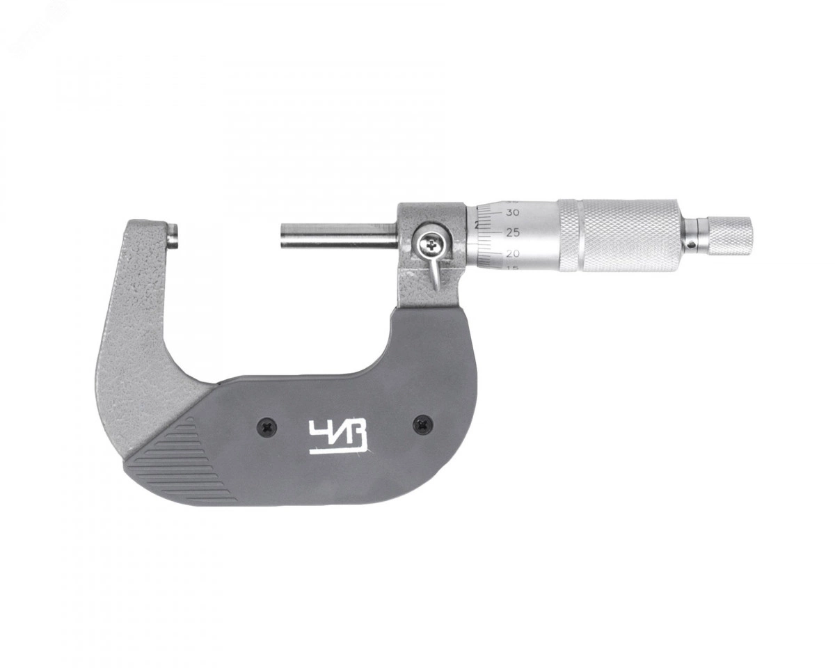 Внесен в госреестр. Регистрационный № 50593-1, ГОCT 6507 -90. Описание. Средство для измерения наружных линейных размеров. Основанием микрометра является скоба, а преобразующим устройством служит винтовая пара, состоящая из микрометрического винта и микрометрической гайки, укрепленной внутри стебля, их часто называют микропарой. В скобу запрессованы пятка и стебель. Измеряемую деталь охватывают торцевыми измерительными поверхностями микровинта и пятки. Барабан присоединен к микровинту с помощью колпачка в котором находится корпус трещотки. Чтобы приблизить микровинт к пятке, вращают барабан трещотку по часовой стрелке (от себя), а для обратного движения микровинта (от пятки) барабан вращают против часовой стрелки (на себя). Закрепляют микровинт в требуемом положении стопором. Верхний предел измерений 50 мм. Цена деления шкалы барабана 0.01 мм.