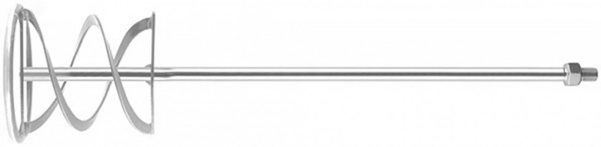 Усиленная конструкция. Насадка на миксер для перемешивания особо вязких и тяжелых строительных смесей. При перемешивании раствор движется снизу вверх. Хвостовик с резьбой М14. Материал - инструментальная сталь, цинковое покрытие. Спиралевидная насадка (венчик) представляет собой длинный стержень с несколькими спиральными витками и защитным кольцом на конце. Они бывают право- и левосторонними. Правосторонние предназначены для приготовления густых цементных и штукатурных смесей. Для смешивания веществ с низкой степенью вязкости - жидких шпатлевок, лакокрасочных материалов - требуется левосторонний венчик.