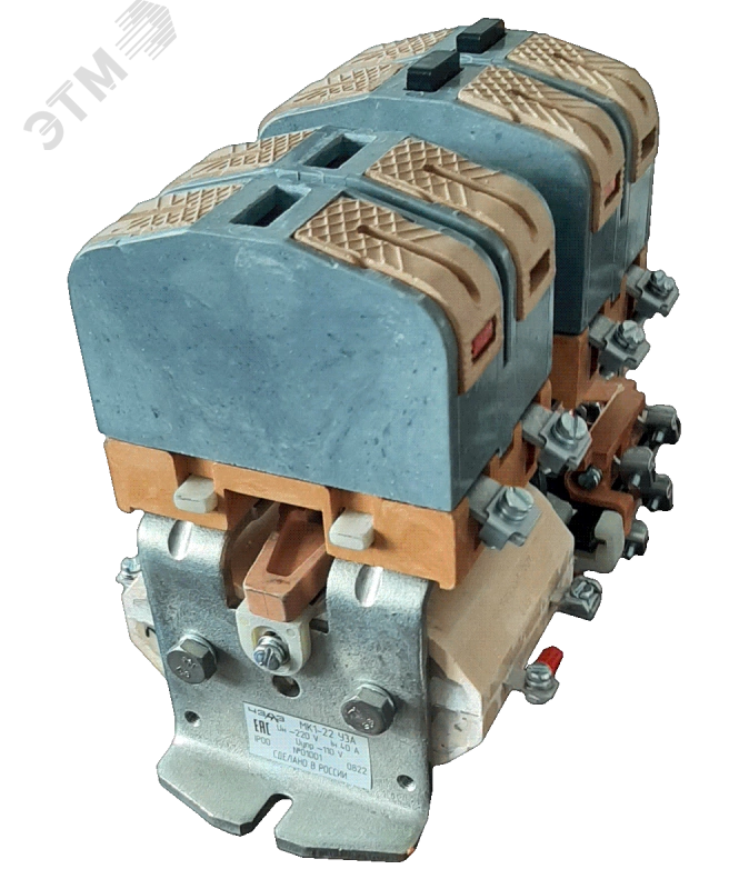 Контактор МК1-22А У3 переменного и постоянного тока предназначен для работы в силовых электрических цепях подвижного состава и общепромышленных стационарных установок. Два однотипных контактора с замыкающими главными контактами, расположенные рядом, допускают установку механической блокировки. Контактор МК1-22У3А допускает установку как на изоляционных или металлических заземленных панелях, так и на рейках. Коммутационная износостойкость контактора МК1-22У3А 40 А Uн-220 В и ~380 В 50 60 Гц Uупр-110 В в/к 2'З'+2'Р' - 2500 тыс. ед. Коммутационная износостойкость контакторов МК1Б – МК4Б составляет не менее половинных значений коммутационной износостойкости соответствующих типоисполнений контакторов МК1А – МК4А. Конструкция контактов вспомогательной цепи допускает преобразование замыкающих контактов в размыкающие и наоборот. При этом число размыкающих контактов контактора МК1-22У3А должно быть не более 50 % от общего числа контактов вспомогательной цепи.