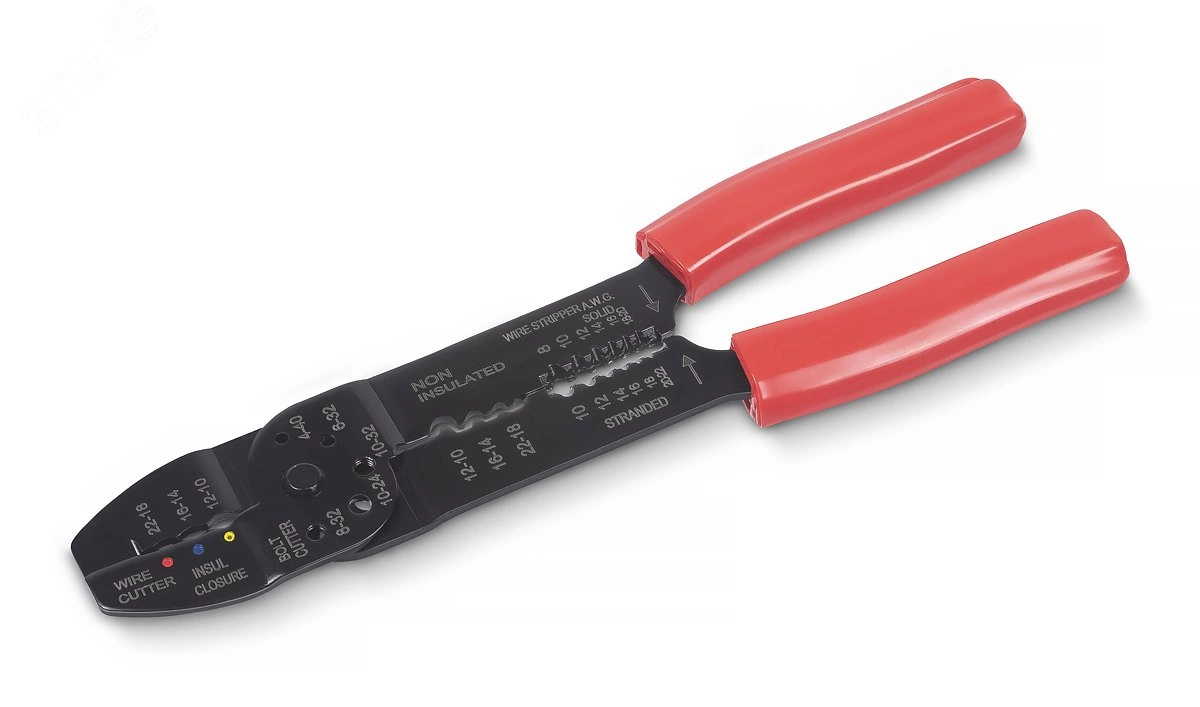 Многофункциональный инструмент для зачистки, обрезки проводов и обжима кабельных наконечников. Предназначен для снятия изоляции (зачистки) с проводов, обжима изолированных наконечников, обрезки винтов и металлических стержней, обжима неизолированных наконечников, обрезки проводов. Изготовлен из среднеуглеродистой стали с покрытием - черное хромирование, рукоятки выполнены из ПВХ.