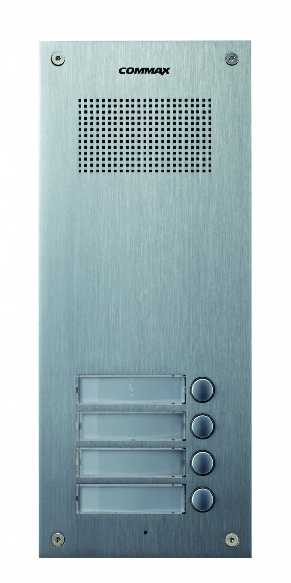 Многоквартирная вызывная DR-4UM(L) SIL панель на 4 абонента с возможностью двухсторонней аудио связи. Металлический антивандальный корпус. 4 металлические кнопки вызова и ячейки для имен вызываемых абонентов с подсветкой. Соединение с аудио трубками осуществляется по 4 проводам - 3 общих провода + 1 к каждой аудио трубке. Совместим с аудио трубкой COMMAX DP-SS и DP-ML.