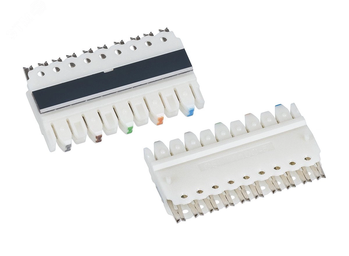 Модули 110 типа предназначены для совместного использования со 110 блоками. Модули устанавливаются одной стороной на 110 блок после разводки на них отдельных пар кабеля, а вторая сторона модуля выполняет роль розеточной части разъема типа 110 и предназначена для подключения коммутационных шнуров и кроссировочных проводов. Для заделки модулей 110 типа рекомендуется использовать инструмент HT-3150R с насадками на 4 или 5 пар.