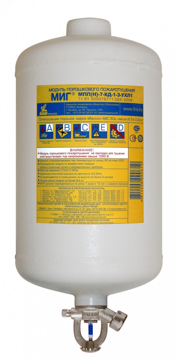 Модуль порошкового пожаротушения настенного и потолочного крепления, нормального исполнения. Предназначен для хранения и подачи огнетушащего вещества в защищаемый объект при тушении пожаров класса А, В, С и электроустановок под напряжением. Является устройством пожаротушения автономным и приводится в действие путем разрушения теплового замка, входящего в состав запорно-пускового устройства, по достижении установленного значения критической температуры в защищаемом помещении. Не предназначен для тушения возгораний щелочных, щелочноземельных металлов и веществ, горение которых может происходить без доступа воздуха. Может применятся для тушения по площади или объему в помещениях административных и жилых зданий, на объектах производственного и складского назначения, во внутренних объемах технологических установок (оборудования), а также на транспорте.
