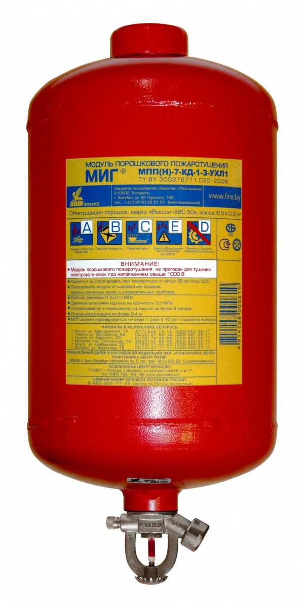 Модуль порошкового пожаротушения настенного и потолочного крепления, нормального исполнения. Предназначен для хранения и подачи огнетушащего вещества в защищаемый объект при тушении пожаров класса А, В, С и электроустановок под напряжением. Является устройством пожаротушения автономным и приводится в действие путем разрушения теплового замка, входящего в состав запорно-пускового устройства, по достижении установленного значения критической температуры в защищаемом помещении. Не предназначен для тушения возгораний щелочных, щелочноземельных металлов и веществ, горение которых может происходить без доступа воздуха. Может применятся для тушения по площади или объему в помещениях административных и жилых зданий, на объектах производственного и складского назначения, во внутренних объемах технологических установок (оборудования), а также на транспорте.