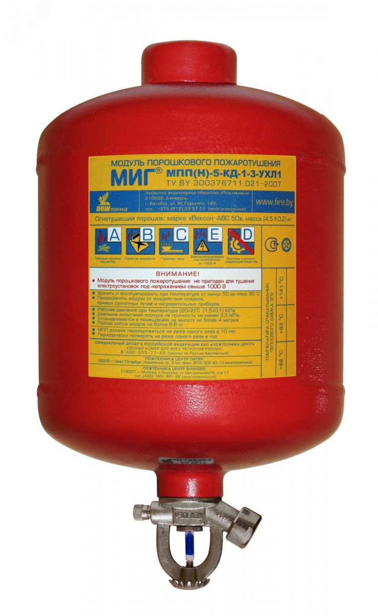 Модуль порошкового пожаротушения настенного и потолочного крепления, нормального исполнения. Предназначен для хранения и подачи огнетушащего вещества в защищаемый объект при тушении пожаров класса А, В, С и электроустановок под напряжением. Является устройством пожаротушения автономным и приводятся в действие путем разрушения теплового замка, входящего в состав запорно-пускового устройства, по достижении установленного значения критической температуры в защищаемом помещении. Не предназначен для тушения возгораний щелочных, щелочноземельных металлов и веществ, горение которых может происходить без доступа воздуха. Может применятся для тушения по площади или объему в помещениях административных и жилых зданий, на объектах производственного и складского назначения категории, во внутренних объемах технологических установок (оборудования), а также на транспорте.