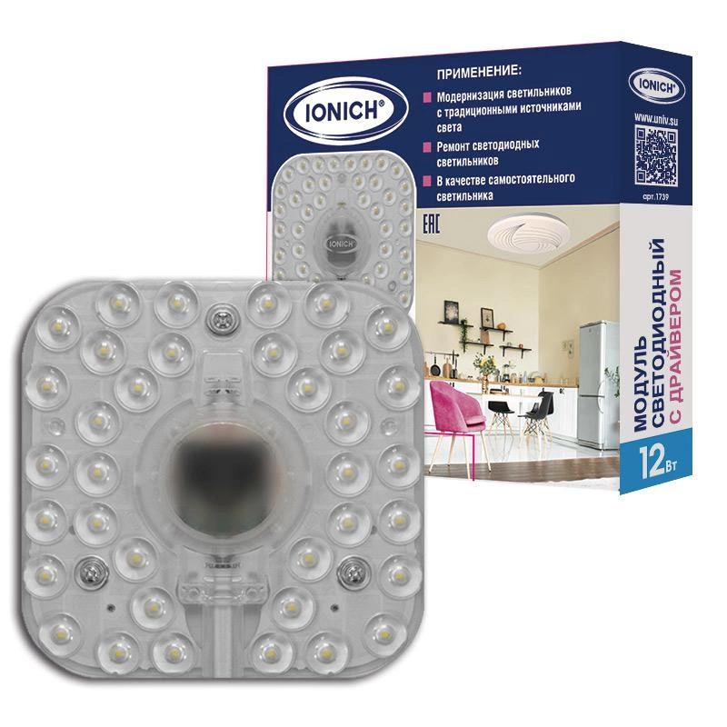 Полное описание: Модуль светодиодный 12Вт 6500К IP20 960лм 230В 98х98мм для декоративных светильников IONICH 1739