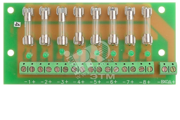 Модуль УРП 1-8 (бескорпусной) Устройство распределения питания с одного выхода на восемь независимых каналов, каждый из которых снабжен цепями защиты и индикацией наличия выходного напряжения.
