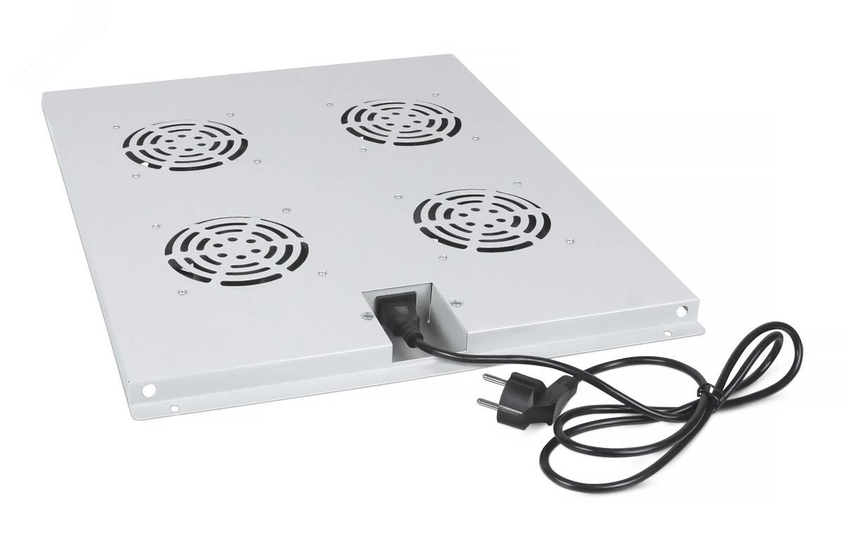 Модуль вентиляторный потолочный предназначен для охлаждения внутренней части телекоммуникационного шкафа путем отвода тепла наружу. Модель предназначена для установки в напольный телекоммуникационный шкаф Cabeus глубиной 800 мм. Вентиляторный модуль состоит из металлического конструктива с закрепленными на нем 4-мя вентиляторами. Питание модуля осуществляется подключением его к сети напряжением 220В с помощью шнура питания IEC 320 C13/Schuko длиной 1,5 м. Покрытие вентиляторного модуля – порошковая краска светло-серая (RAL7035). Установка модуля производится путем крепления с внутренней стороны шкафа к верхней его части.