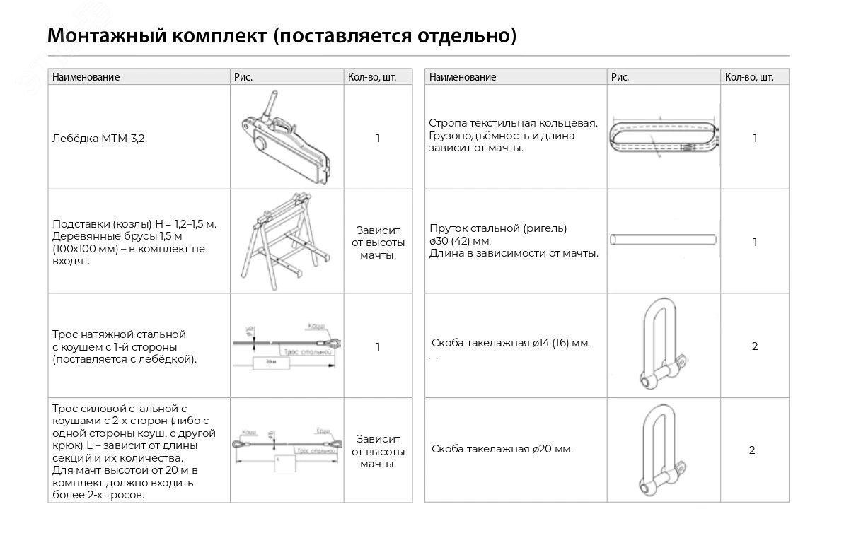 Монтажный комплект необходим для сборки мачт перед монтажом. Сборка и установка производятся в соответствии с инструкцией (прилагается к каждой партии поставляемых изделий OPORA ENGINEERING). Монтажный и эксплуатационный комплекты поставляются отдельно.