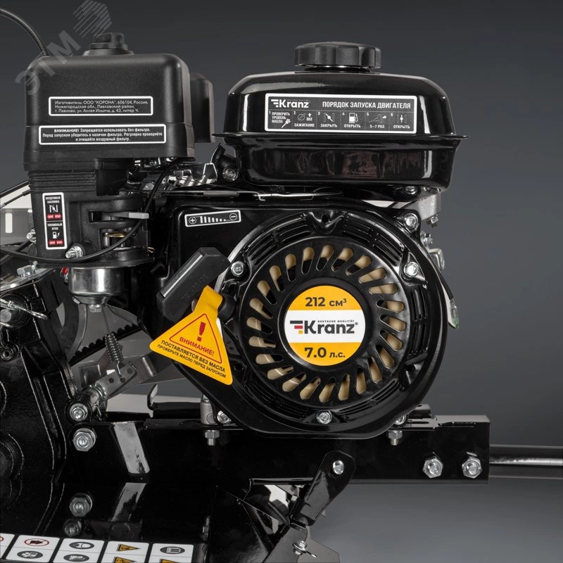 Мотоблок предназначен для рыхления, вспахивания почвы, прополки и других работ в поле, на огороде и придомовой территории. Четырехтактный двигатель объемом 212 см3 и мощностью 7 л/с с надежным карбюратором и воздушным фильтром обеспечивают стабильную работу. Тип моторного масла – SAE 5W30/SAE 10W40 (полусинтетическое). Мотоблок оборудован коробкой передач с 3 скоростями вперед и 1 назад. Механизм сцепления – ременной. Регулятор оборотов и выключатель зажигания расположены на рукоятках. Для идеального равновесия мотоблок отцентрован на заводе. 24 фрезы 3х4 из закаленной стали не нуждаются в дополнительной заточке. Для культивации земли вместо колес устанавливаются две фрезы. Сошник с регулировочными отверстиями обеспечивает выбор глубины культивации (до 35 см).