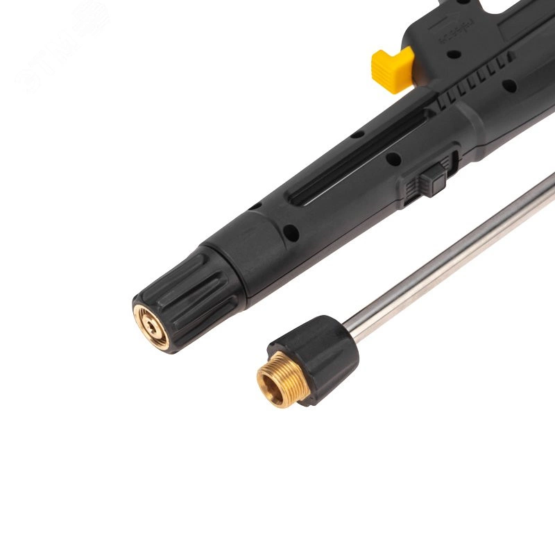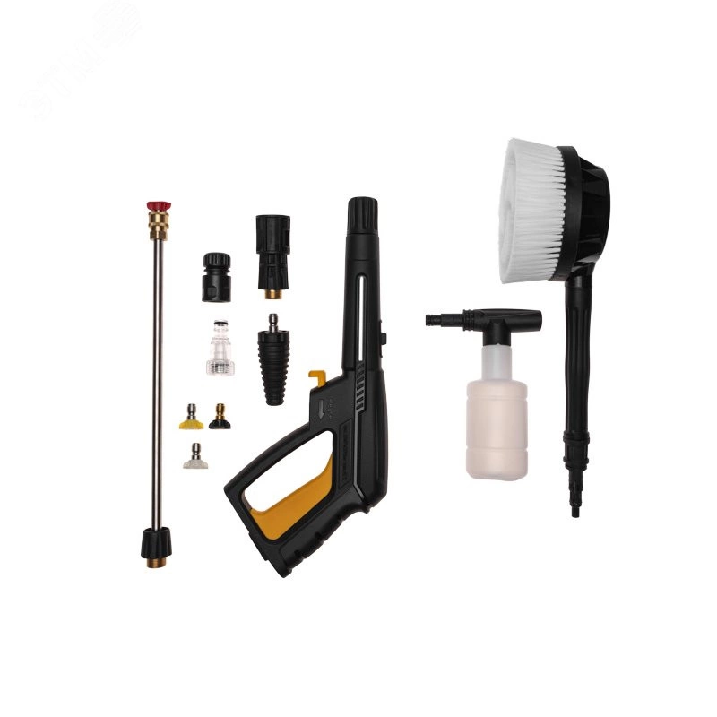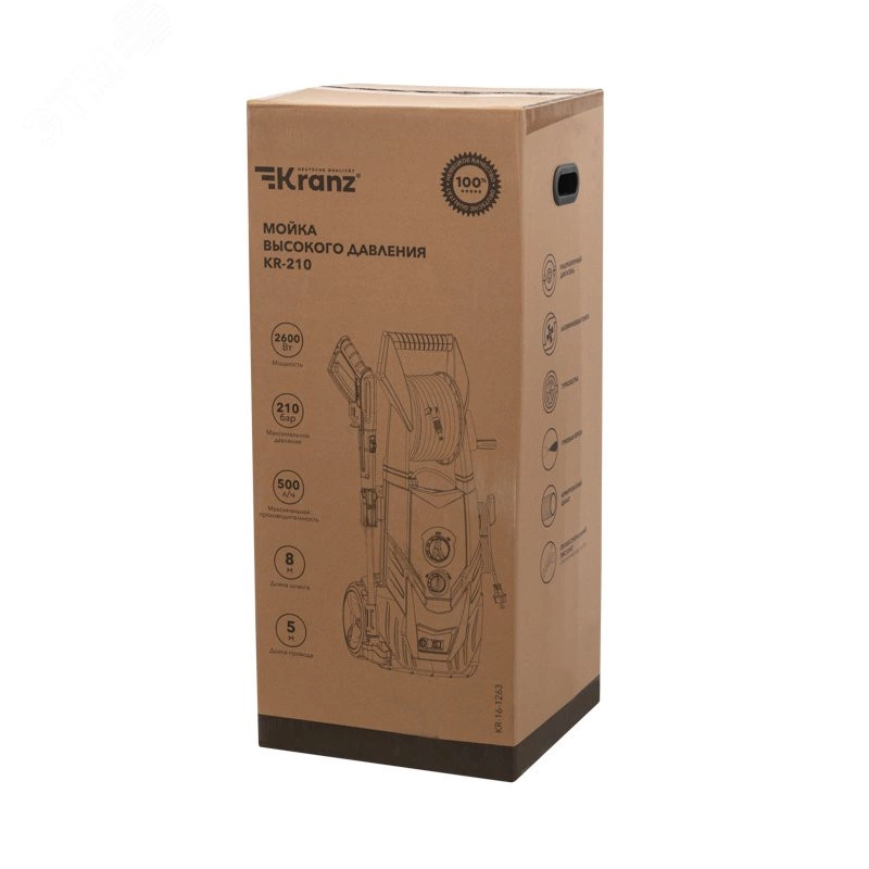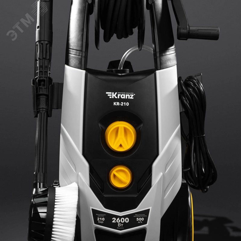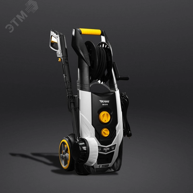 Мойка высокого давления KR-210 эффективно устраняет различные виды загрязнений при помощи струи воды под высоким давлением. Мощный двигатель 2600 Вт обеспечивает давление до 210 бар и производительность до 500 л/ч. Алюминиевая помпа гарантирует стабильное давление. Блокировка рычага пистолета исключает случайную подачу воды. При перегреве мотор отключается автоматически. Фильтр тонкой очистки защищает компоненты мойки и очищаемую поверхность от повреждений. Функция самостоятельного забора воды позволяет использовать мойку в местах без водопровода. Форма и интенсивность струи регулируются с помощью сопла. Мойка отличается мобильностью благодаря кабелю длиной 5 м и армированному шлангу 8 м. На корпусе мойки располагается держатель пистолета и распылителя, а также крюк для крепления провода. В комплект входит пеногенератор и быстросъемные коннекторы фиксации шланга и насадок.