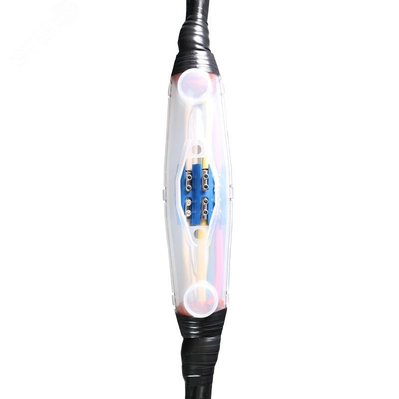 Предназначены для соединения силовых кабелей - с пластмассовой изоляцией (ПВХ/СПЭ) с броней или без брони на напряжение до 1 кВ, с пластмассовой изоляцией (ПВХ/СПЭ) с броней или без брони на напряжение до 1 кВ. Комплект муфты универсален и может быть использован на 3-х жильных, 4-х жильных и 5-ти жильных кабелях. Для соединения жил возможно использование гильз под опрессовку. В качестве изоляционного и герметизирующего вещества используется двухкомпонентный самоотвердевающий полимерный компаунд. Полимерный компаунд поставляется в отдельных секциях прочной полиэтиленовой упаковки с разделителем. При монтаже разделитель снимается и компаунды тщательно перемешиваются перед заливанием в корпус муфты. Не требуют использования открытого пламени для монтажа и могут применяться в местах с особыми требованиями к пожаро- и взрывобезопасности. Прозрачный корпус муфты обеспечивает визуальный контроль за равномерным заполнением всех междужильных пустот.