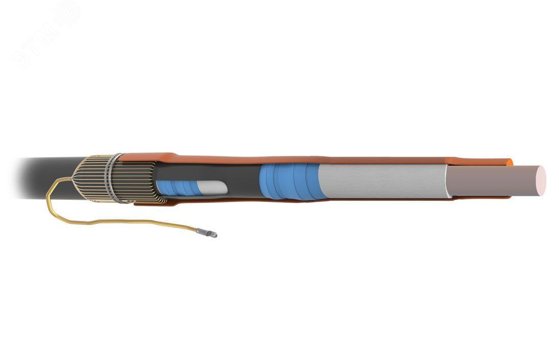 Муфта предназначена для оконцевания одножильного кабеля без брони с изоляцией из сшитого полиэтилена и экраном из медных проволок на напряжение до 10кВ для наружней установки. В составе муфты применяются трубки стресс-контроля снижающие риск пробоя изоляции на срезе полупроводящего слоя и специальный герметик со свойствами выравнивания напряженности электрического поля. Использование изолирующей антитрекинговой трубки и изолятора снижает риск пробоя по поверхности изоляции. Провод заземления формируется из проволочного экрана кабеля и оконцовывается наконечником под опрессовку.