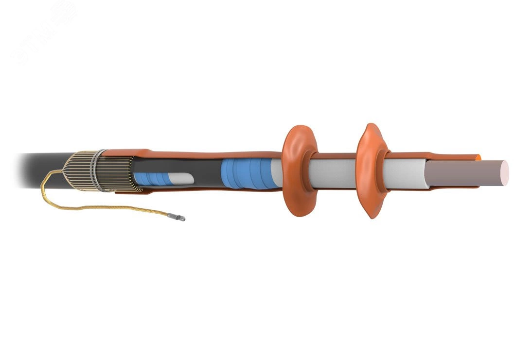 Муфта предназначена для оконцевания одножильного кабеля без брони с изоляцией из сшитого полиэтилена и экраном из медных проволок на напряжение до 10кВ для внутренней установки. В составе муфты применяются трубки стресс-контроля снижающие риск пробоя изоляции на срезе полупроводящего слоя и специальный герметик со свойствами выравнивания напряженности электрического поля. Использование изолирующей антитрекинговой трубки снижает риск пробоя по поверхности изоляции. Провод заземления формируется из проволочного экрана кабеля и оконцовывается наконечником под опрессовку.