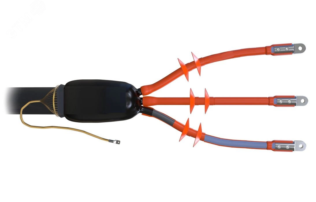 Муфта предназначена для оконцевания трехжильного кабеля без брони с изоляцией из сшитого полиэтилена и экраном из медных проволок на напряжение до 10кВ для наружной установки. В составе муфты применяются трубки стресс-контроля снижающие риск пробоя изоляции на срезе полупроводящего слоя и специальный герметик со свойствами выравнивания напряженности электрического поля. Использование изолирующей антитрекинговой трубки и изолятора снижает риск пробоя по поверхности изоляции. Термоплавкий клей, нанесенный на внутреннюю поверхность термоусаживаемых трубок, обеспечивает полную герметичность муфты после монтажа.