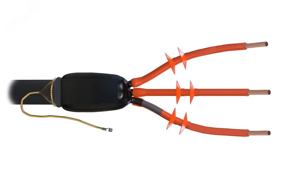 Муфта предназначена для оконцевания трехжильного кабеля без брони с изоляцией из сшитого полиэтилена и экраном из медных проволок на напряжение до 10кВ для наружной установки. В составе муфты применяются трубки стресс-контроля снижающие риск пробоя изоляции на срезе полупроводящего слоя и специальный герметик со свойствами выравнивания напряженности электрического поля. Использование изолирующей антитрекинговой трубки и изолятора снижает риск пробоя по поверхности изоляции. Термоплавкий клей, нанесенный на внутреннюю поверхность термоусаживаемых трубок, обеспечивает полную герметичность муфты после монтажа. Провод заземления формируется из проволочного экрана кабеля и оконцовывается наконечником под опрессовку.
