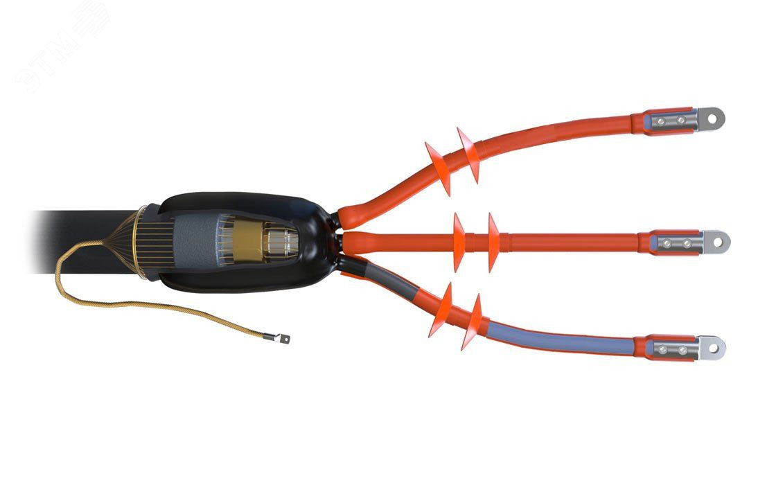 Муфта предназначена для оконцевания трехжильного кабеля с броней с изоляцией из сшитого полиэтилена и экраном из медных проволок на напряжение до 10кВ для наружной установки. В составе муфты применяются трубки стресс-контроля снижающие риск пробоя изоляции на срезе полупроводящего слоя и специальный герметик со свойствами выравнивания напряженности электрического поля. Использование изолирующей антитрекинговой трубки и изолятора снижает риск пробоя по поверхности изоляции. Термоплавкий клей, нанесенный на внутреннюю поверхность термоусаживаемых трубок, обеспечивает полную герметичность муфты после монтажа.