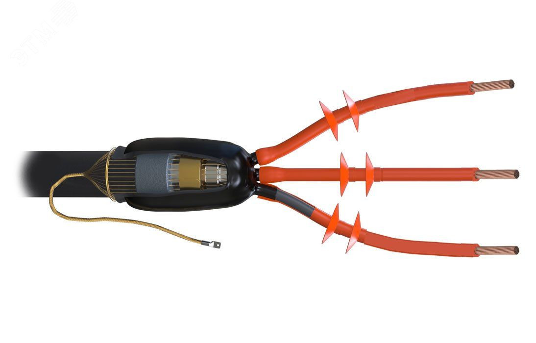 Муфта предназначена для оконцевания трехжильного кабеля с броней с изоляцией из сшитого полиэтилена и экраном из медных проволок на напряжение до 10кВ для внутренней установки. В составе муфты применяются трубки стресс-контроля снижающие риск пробоя изоляции на срезе полупроводящего слоя и специальный герметик со свойствами выравнивания напряженности электрического поля. Использование изолирующей антитрекинговой трубки снижает риск пробоя по поверхности изоляции. Термоплавкий клей, нанесенный на внутреннюю поверхность термоусаживаемых трубок, обеспечивает полную герметичность муфты после монтажа. Провод заземления формируется из проволочного экрана кабеля, пружины постоянного давления и оконцовывается наконечником под опрессовку.