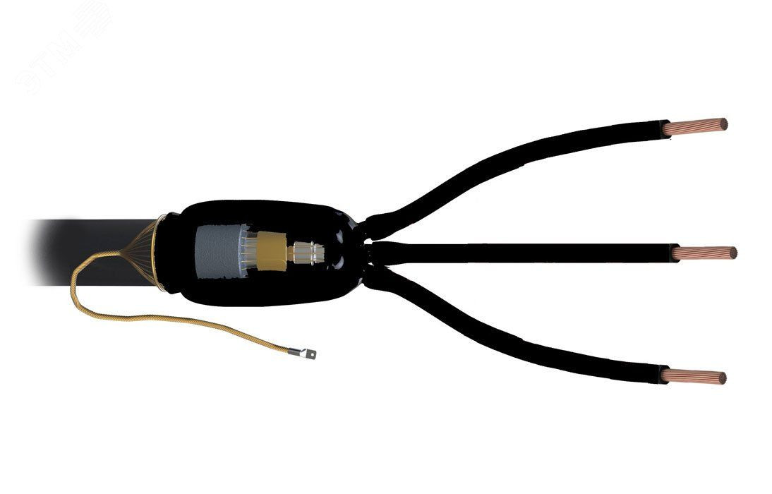 Муфта предназначена для оконцевания трехжильного кабеля с броней с изоляцией из сшитого полиэтилена и экраном из медных проволок на напряжение до 10кВ для внутренней установки. В составе муфты применяются трубки стресс-контроля снижающие риск пробоя изоляции на срезе полупроводящего слоя и специальный герметик со свойствами выравнивания напряженности электрического поля. Использование изолирующей антитрекинговой трубки снижает риск пробоя по поверхности изоляции. Термоплавкий клей, нанесенный на внутреннюю поверхность термоусаживаемых трубок, обеспечивает полную герметичность муфты после монтажа. Провод заземления формируется из проволочного экрана кабеля, пружины постоянного давления и оконцовывается наконечником под опрессовку.