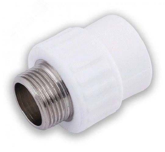 Комбинированный полипропиленовый фитинг, закладная деталь изготовлена из латуни марки ЛС-59-1. Используется для соединения полипропиленовой трубы и элемента системы с резьбовым соединением. Латунные части производятся методом горячего штампования, пластиковые - методом литья под давлением.