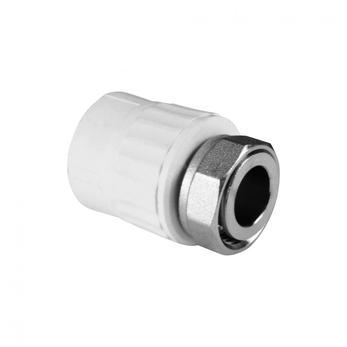 Комбинированный полипропиленовый фитинг. Представляет собой разъемное соединение между пластиковой и металлической трубами. Латунные части производятся методом горячего штампования, пластиковые - методом литья под давлением