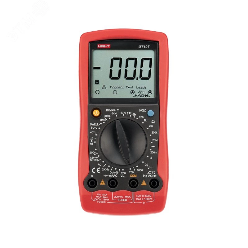 Автомобильный тестер UNI-T UT107. UT105 — прибор, специально разработанный для снятия автомобильных показателей. С его помощью можно измерять число оборотов коленчатого вала, угол замкнутого состояния контактов прерывателя трамблера, сопротивление, постоянное и переменное напряжение, постоянный и переменный ток, диод, звуковое устройство и транзистор. Данный прибор — незаменимый помощник при обслуживании и ремонте автомобиля.