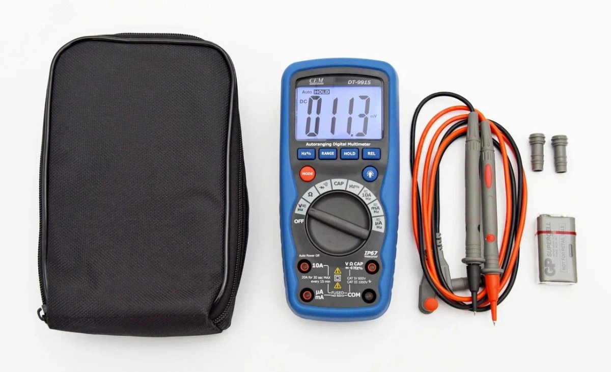 Прорезиненный ударопрочный корпус обеспечивает защиту прибора от различных механических повреждений. Ударопрочная защищенная конструкция позволяет прибору работать в жестких условиях эксплуатации. Эргономичный и современный дизайн имеет подставку-упор для удобного вертикального расположения. Предназначены для использования как внутри помещений, так и снаружи. Подсветка дисплея LCD. Автоматическое отключение питания. Защита от перегрузок IEC61010 CAT IV 600V, CAT III 1000V. Защита входов до 1000В на всех диапазонах. Предохранитель 10А/1000В и 0. 5А/1000В на всех токовых диапазонах. Относительные измерения REL. Удержание показаний DATA HOLD. Автовыбор диапазона. Область применения - ЖКХ, в быту. Энергетика - диагностика электрических соединений. Радиоэлектроника и диагностика электрических приборов. DT-9915 - серия мультиметров с разрядностью шкалы 4000 отсчетов. Мультиметры сочетают в себе точность, простоту в использовании, безопасность и надежность.