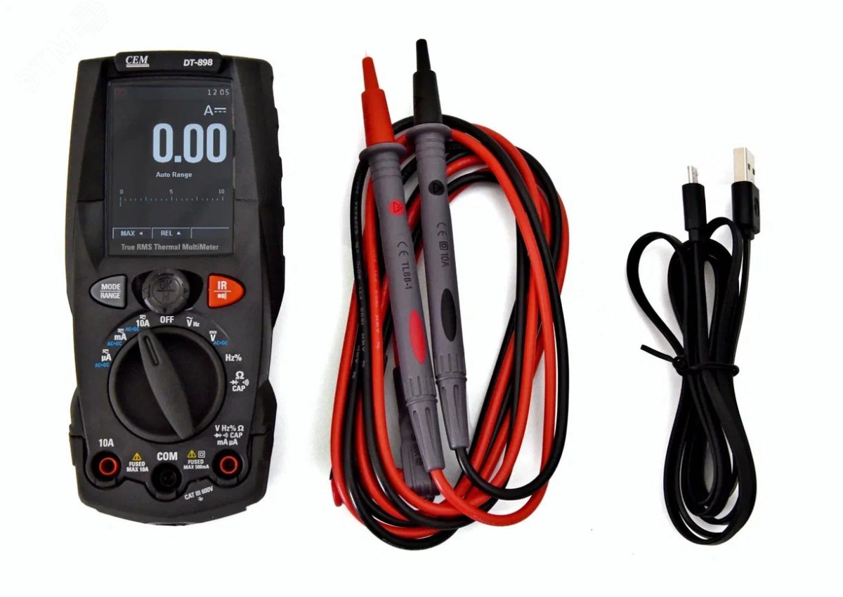 DT-898 Профессиональный, промышленный цифровой мультиметр TRMS с встроенным тепловизором оснащен цветным TFT ЖК-дисплеем и обеспечивает аналого-цифровое преобразование сигнала с высокой точностью и малым временем отклика. Пользуясь этим прибором, можно без труда обнаружить и затем устранить проблемы в проводке промышленного оборудования. Безопасность измерений гарантируется за счет применения усиленного пластмассового корпуса. Особенности тепловизора CEM модели DT-898. 2. 4' TFT цветной ЖК-дисплей с 4000 отчетов. Встроенный тепловизор с прицельным указанием максимального, минимального и среднего значений. Быстрая смена кадров тепловизора на частоте 50Гц. Измерение постоянного напряжения. Измерение переменного напряжения, напряжения AC+DC TRMS. Измерение постоянного тока. Измерение переменного тока, тока AC+DC TRMS. Проверка сопротивления и контроль на обрыв. Тест целостности диодов. Измерение емкости конденсаторов. Измерение частоты. Измерение коэффициента заполнения.