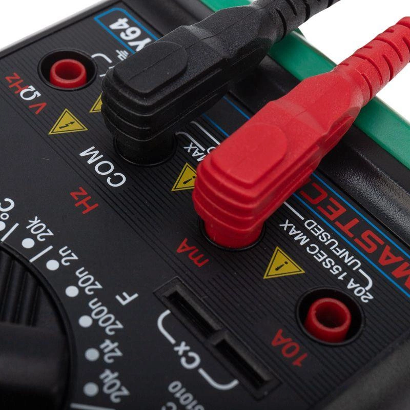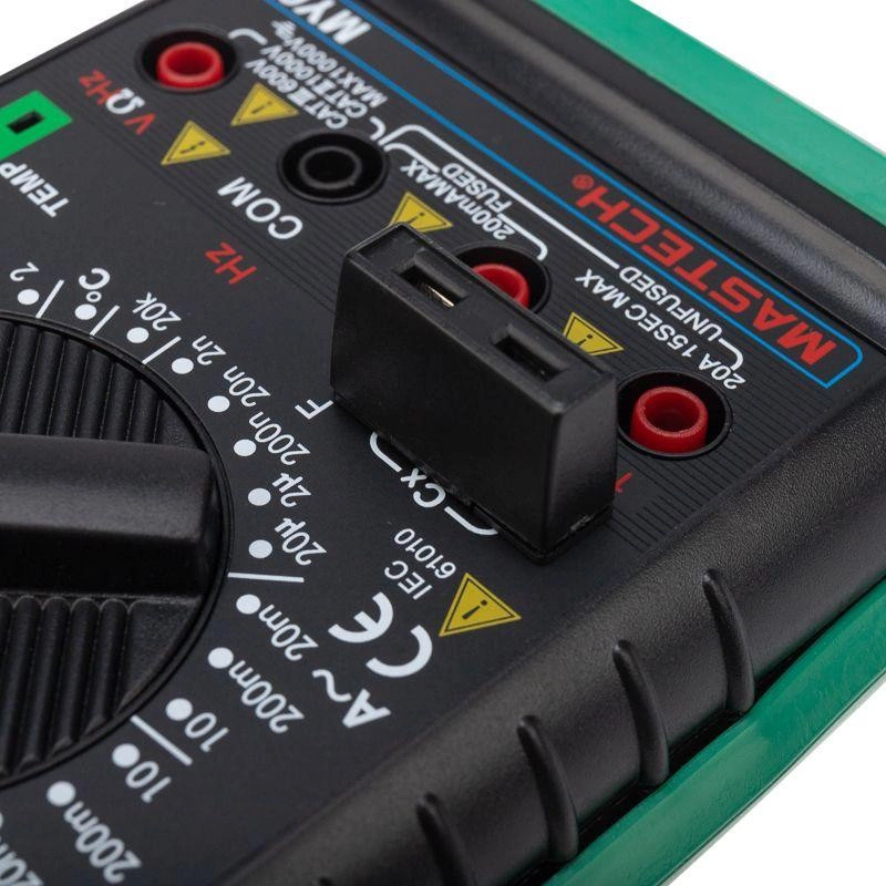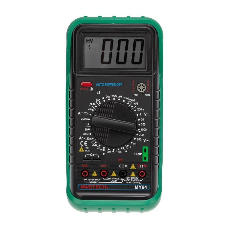 Мультиметр —электроизмерительный прибор который включает в себя несколько функций и набор измеряемых параметров. Все приборы серии MY64 измеряют постоянное и переменное напряжение, постоянный и переменный ток, сопротивление в цепи, емкость, температуру и даже частоту. А так же с помощью данного прибора можно проводить тестирование диодов, прозвонку целостности цепи и измерение коэффициента усиления транзисторов. Прибор имеет функцию удержания результата измерений Data hold, для тех случаев, когда измерения проводятся в труднодоступных местах и не всегда есть возможность взглянуть на экран. Прибор MY64 является портативным мультиметром, компактные размеры позволяют всегда носить его с собой. Но, несмотря на малые размеры, данный мультиметр обладает широким функционалом и это выгодно отличает его от других. Инженеры старались сделать прибор максимально удобным для использования. Выбор измеряемых величин и пределов измерений производиться с помощью усиленного поворотного регулятора, благодаря которому исключается возможность случайного нажатия. Прибор изготовлен из высококачественных материалов, калибровка и тестирование приборов произведено под контролем компании REXANT INTERNATIONAL.
