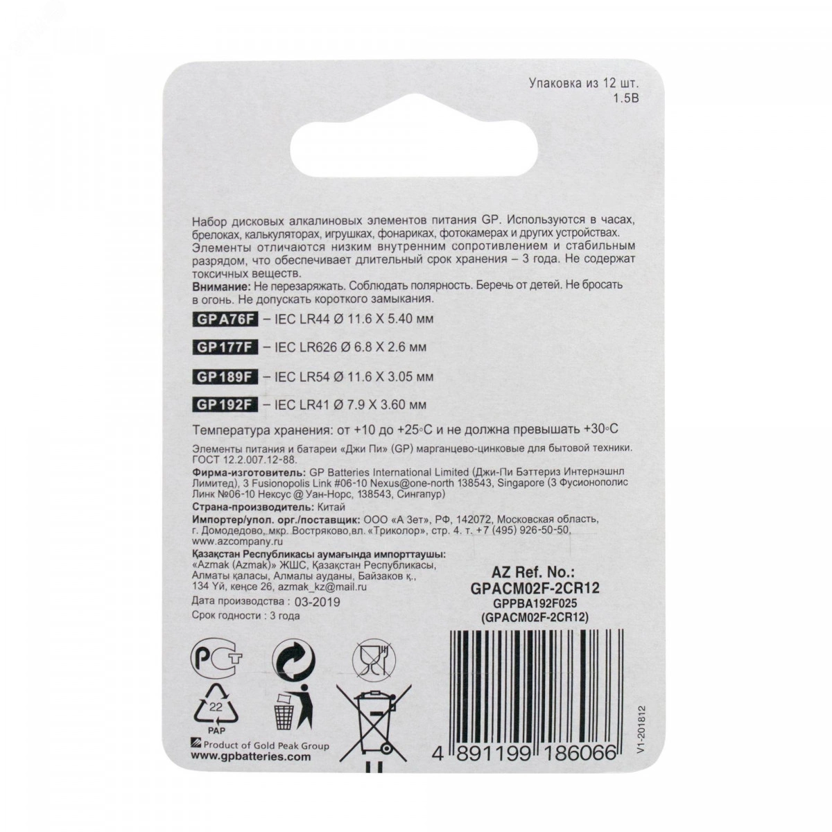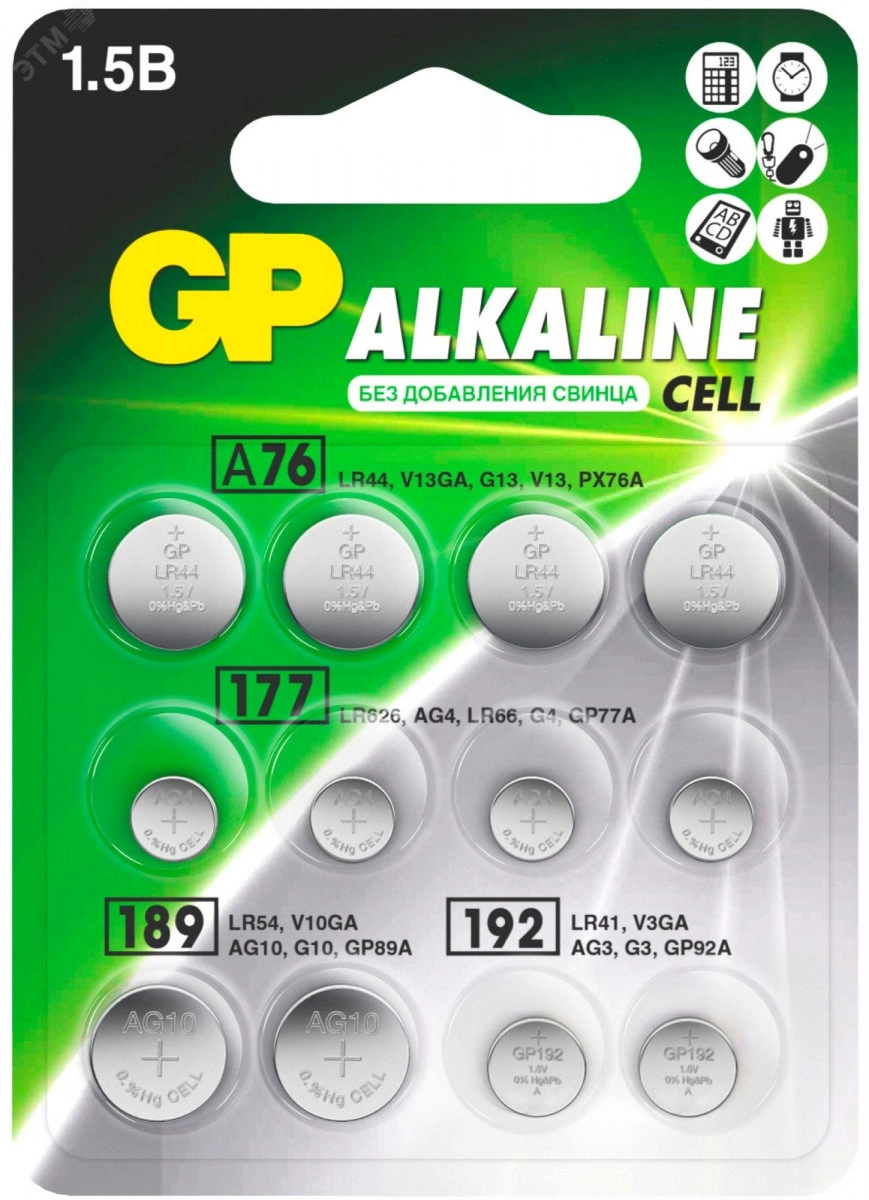 В новый комплект миниатюрных дисковых (''пуговичных'') батареек от компании GP входят 12 элементов питания на основе марганцево-цинкового (алкалинового) соединения. Подходят для использования в наручных часах, автобрелоках, калькуляторах, небольших карманных фонариках, лазерных указках, а также во множестве разновидностей детских игрушек. Компактная упаковка из 12-ти батареек обойдётся вам значительно дешевле, чем если бы вы приобретали элементы питания по одному. Ими можно обеспечить энергией несколько устройств одновременно. У батареек низкое внутреннее сопротивление и стабильный разряд. Это обусловливает длительный срок службы батареек (у солевых элементов питания жизненных цикл значительно короче).