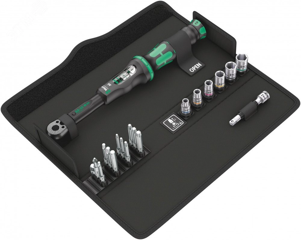Динамометрический ключ Klick в легко узнаваемом дизайне Wera. Очень прочная конструкция при высокой точности в соответствии со стандартом DIN EN ISO 6789-1 -2017-07. Простая установка и фиксация требуемого значения момента затяжки. Слышимый и ощущаемый щелчок при выборе на шкале значений дополнительно облегчает точную установку требуемого момента затяжки. Надёжный механизм срабатывания обеспечивает отчётливо слышимый и ощущаемый сигнал-щелчок при достижении установленного момента затяжки. Рассчитан на правостороннею затяжку, с реверсной трещоткой на 45 зубцов. Динамометрический ключ Wera Klick дополняется большим ассортиментом принадлежностей и комплектуется для работы в виде данного набора. Содержимое набора - Click-Torque A 6 1/4'' 2,5 - 25 Нм, 6 торцевых головок с приводом 1/4'', 11 битов под внутренний шестигранник Hex-Plus, PH и TORX, а также удлинитель и переходник.