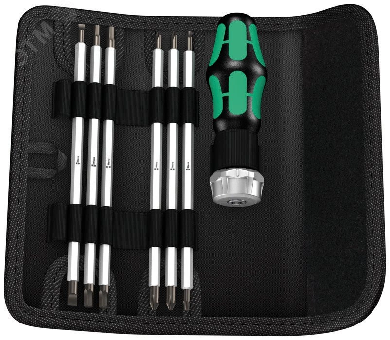 Складная сумка с 6 двусторонними рабочими концами Wera Vario длиной 175 мм, шестигранными 6 мм. Ручка-держатель Kraftform Kompakt Vario RA с трещоткой, тонкий механизм зацепления для малого угла возврата, дисковый переключатель (вращение вправо, блокировка, влево), максимальный момент силы до 50 Нм - посадочное гнездо 6 мм под шестигранные рабочие концы Vario, 6 двусторонних рабочих концов Vario (- 12 разных размеров). Удобное хранение и извлечение инструментов.