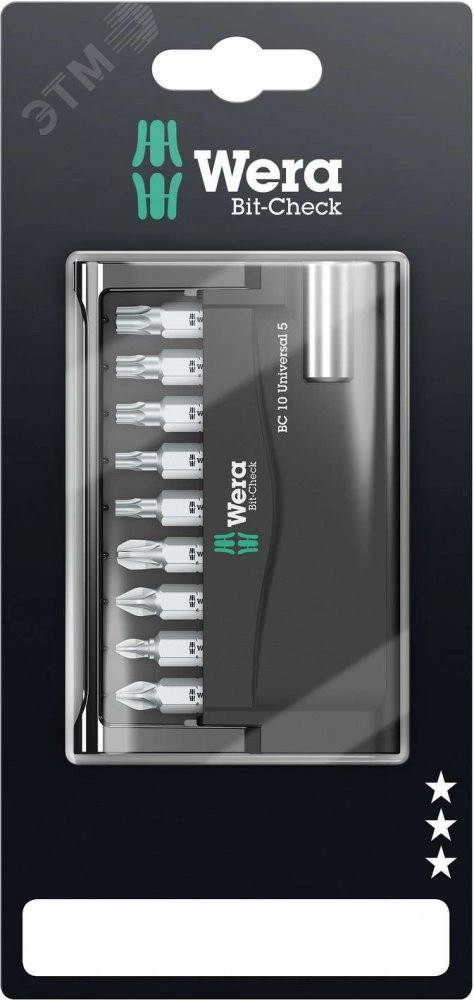 Набор в прочном футляре Bit-Check фирмы Wera. Наборы Bit-Check обеспечивают полный обзор всех размещённых инструментов. Лишние в работе биты просто возвращаются на свое место в футляре, чтобы не потерялись. Простая переноска, например, в кармане рубашки. Набор включает универсальный держатель с гильзой из специальной стали, стопорным кольцом и сильным постоянным магнитом для битов с шестигранным хвостовиком 1/4'' по стандарту DIN ISO 1173-C 6,3. Для установки в шуруповерт или патрон электродрели. Набор включает торсионные биты против быстрого износа. Закалённые до вязкой твёрдости, для универсального применения.