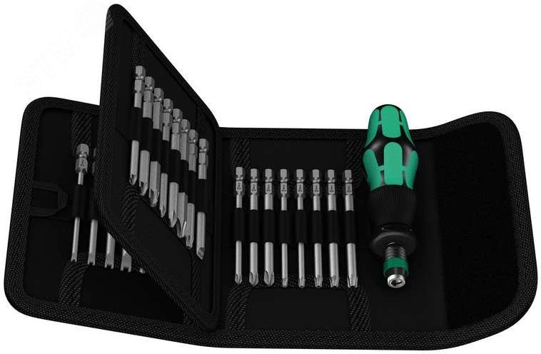 Складная сумка для крепления на поясе с битами длиной 89 мм. Набор включает ручку-держатель 816 R Kraftform с быстрозажимным патроном ''Rapidaptor'' и многокомпонентной ручкой Kraftform для малоутомительной работы. Подходит для завинчиваний в ручном и машинном режимах. 33 предмета.