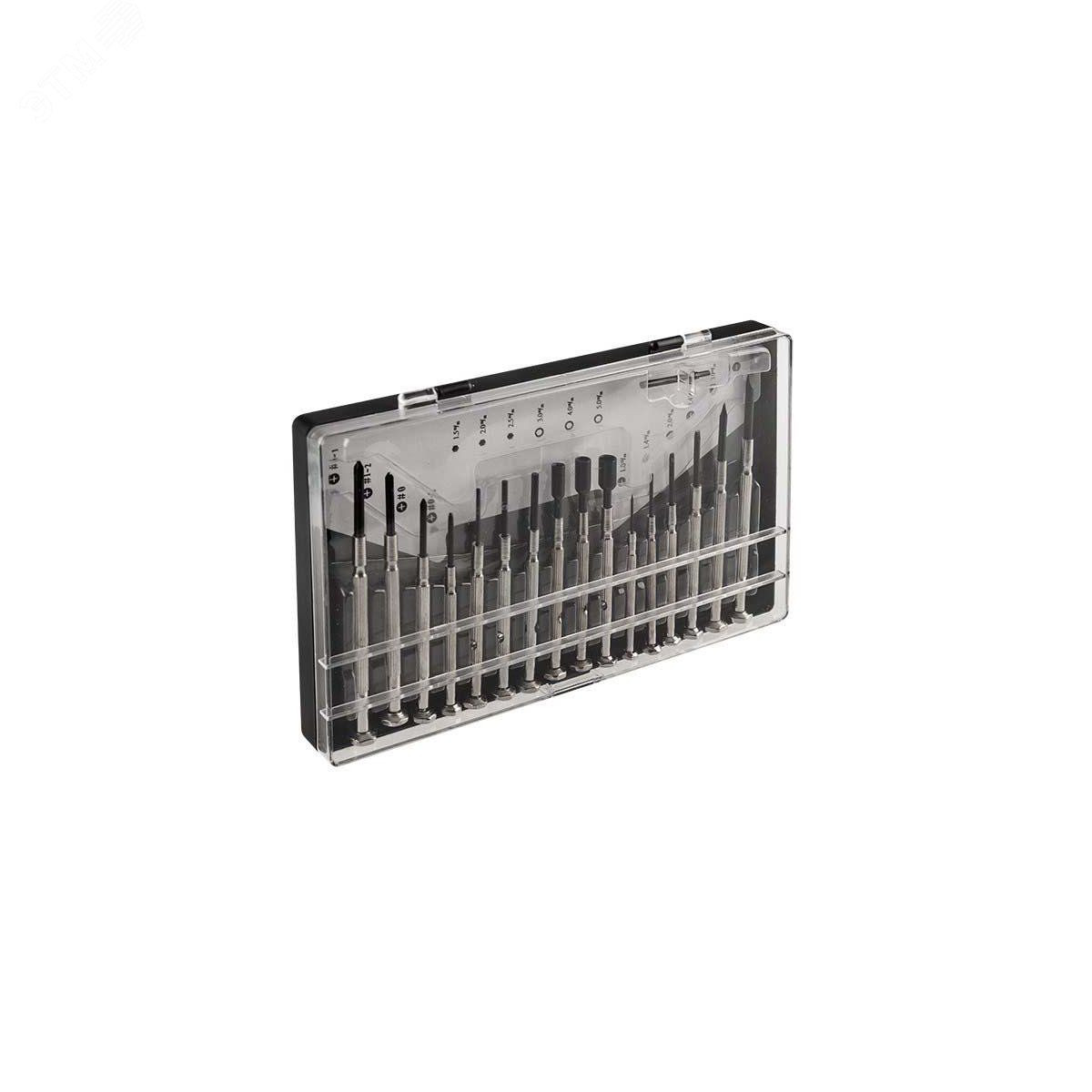Набор часовых отверток предназначен для выполнения высокоточных механических работ- монтаж и ремонт электроаппаратуры - телевизоров, телефонов, очков, компьютеров, видеокамер, сборка и ремонт часов и т.п. Набор часовых отверток из 16 предметов включает в себя- - отвертки шлицевые – 6 штук разных размеров (1.0мм, 1.4мм, 2.0мм, 2.4мм, 3.0мм, 3.5мм), - отвертки крестообразные – 4 штуки (#0-2, #0, #1-2, #1-1), - отвертки под внутренний шестигранник - 3 штуки (1.5, 2.0, 2.5), - отвертки под внешний шестигранник - 3 штуки (3.0, 4.0, 5.0). Все отвертки оснащены намагниченными наконечниками. Диаметр рукоятки точно соответствует крутящему моменту, поэтому при работе с этим инструментом срыв резьбы или разрыв деталей практически невозможен. Жало изготовлено из высокопрочного металла, что гарантирует его долговечность и износоустойчивость.