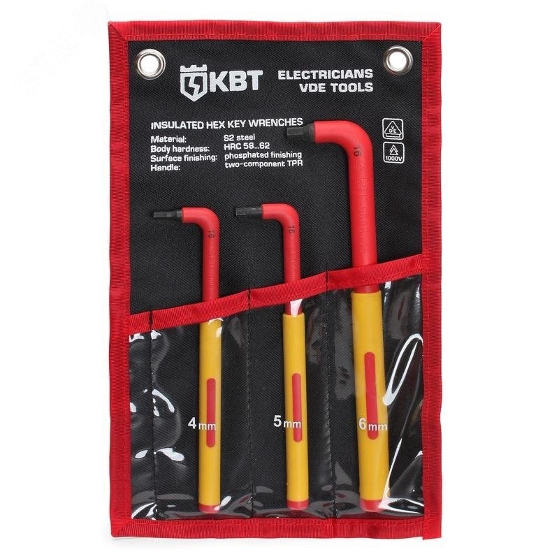 Для работы под напряжением до 1000 В, набор диэлектрических имбусовых шестигранных ключей - 4, 5, 6 мм. Твердость стержня - HRC 58-62. Материал стержня - сталь S2. Обработка поверхности - воронение. Двухкомпонентные рукоятки с прорезиненным нескользящим покрытием. Маркировка типоразмера и VDE-сертификации по IEC 609000 — на каждом ключе. Прочная и удобная раскладная сумка с ремнем-липучкой и крепежными отверстиями под евростенды. Вес набора - 327 г