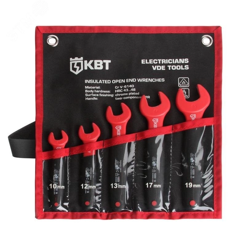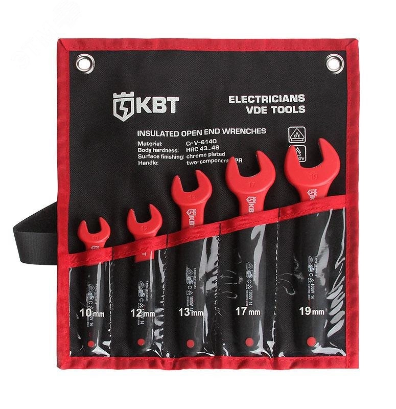 Для работы под напряжением до 1000 В. Состав набора - диэлектрические однорожковые ключи - 10, 12, 13, 17, 19 мм. Материал изоляции - полипропилен (РР). Изолирующее покрытие, нанесенное в термопластавтоматах, гарантирует высокие изоляционные свойства и надежность VDE инструмента. Инструментальная хром-ванадиевая сталь. Двухкомпонентные рукоятки с прорезиненным нескользящим покрытием. Маркировка типоразмера и VDE-сертификации по IEC 609000 - на каждом ключе. Прочная и удобная раскладная сумка с ремнем-липучкой и крепежными отверстиями под евростенды. Вес набора - 560 г