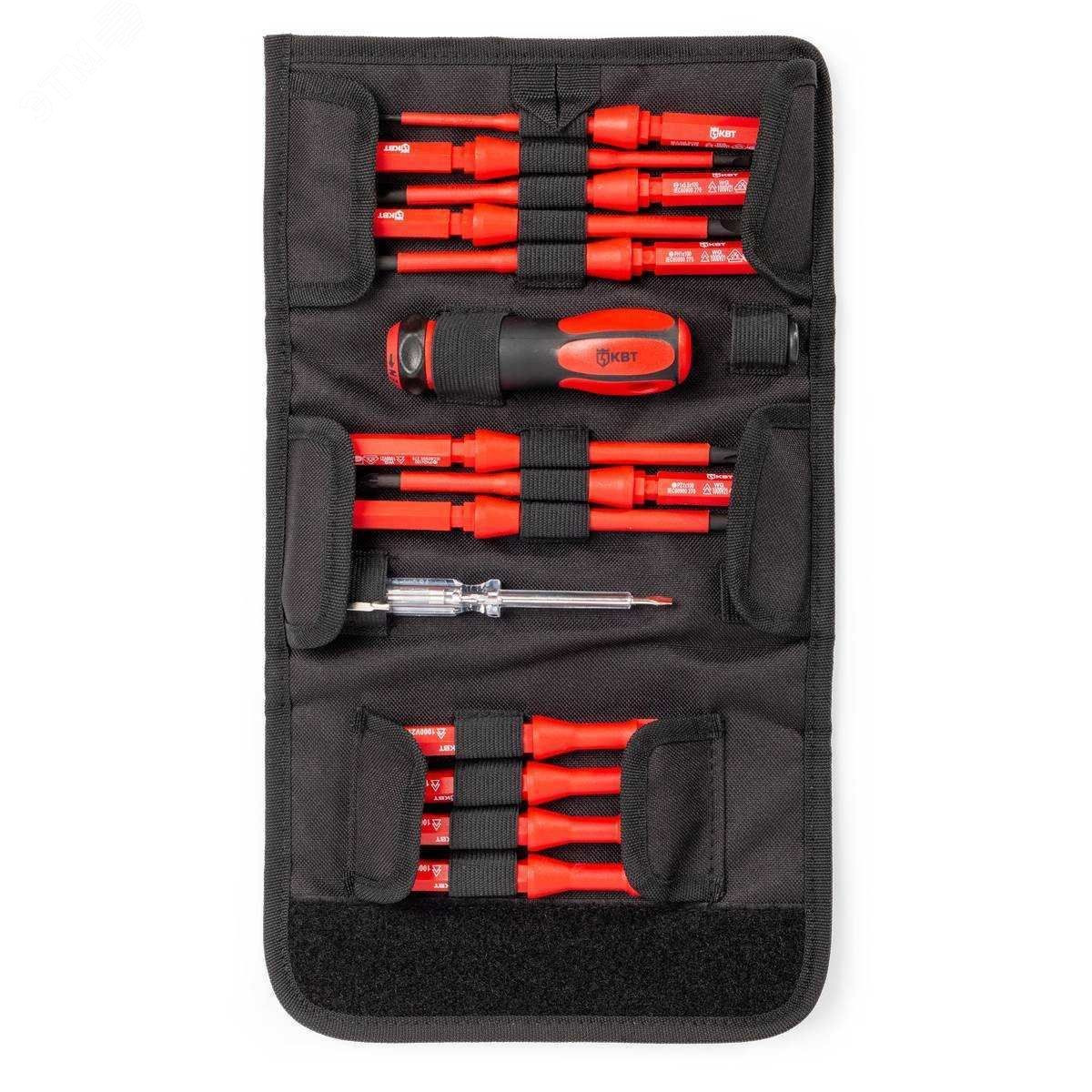 Состав набора - отвертка - шлиц 2.5х100, отвертка - шлиц 4.0х100, отвертка - шлиц 5.5х100, отвертка - шлиц 6.5х100, отвертка - PH1х100, отвертка - PH2х100, отвертка - PZ1х100, отвертка - PZ2х100, тестер напряжения 110–250 В, ключ для электрошкафов - 6x47, ключ для электрошкафов - 8x47, ключ для электрошкафов - 9x47, ключ для электрошкафов - 5.3x47, Рукоятка для сменных отверток. Вращающаяся насадка на стержни для работ с электроникой. Для работы под напряжением до 1000 В. Материал стержня - хром-молибденовая сталь. Вороненые намагниченные наконечники. Материал изоляции стержня - полипропилен. На каждой отвертке — маркировка типоразмера. Двухкомпонентная рукоятка с мягкими вставками из термопластрезины. Надежный поворотный механизм фиксации рукоятки. Упаковка - прочная раскладывающаяся сумка с широкой застежкой-липучкой и петлей под ремень для ношения на поясе. Вес набора - 500 г