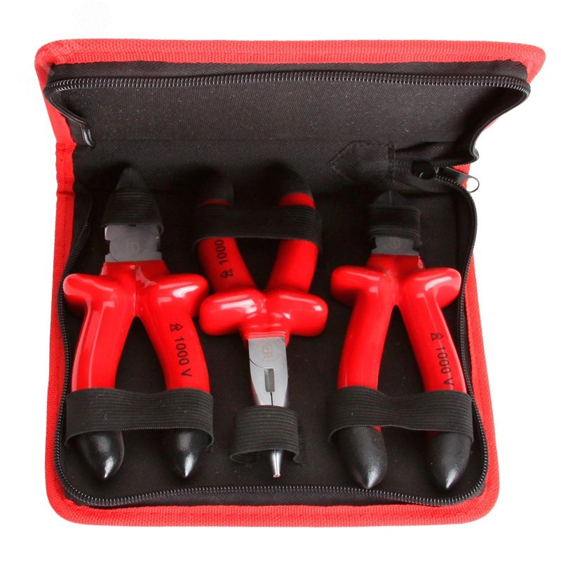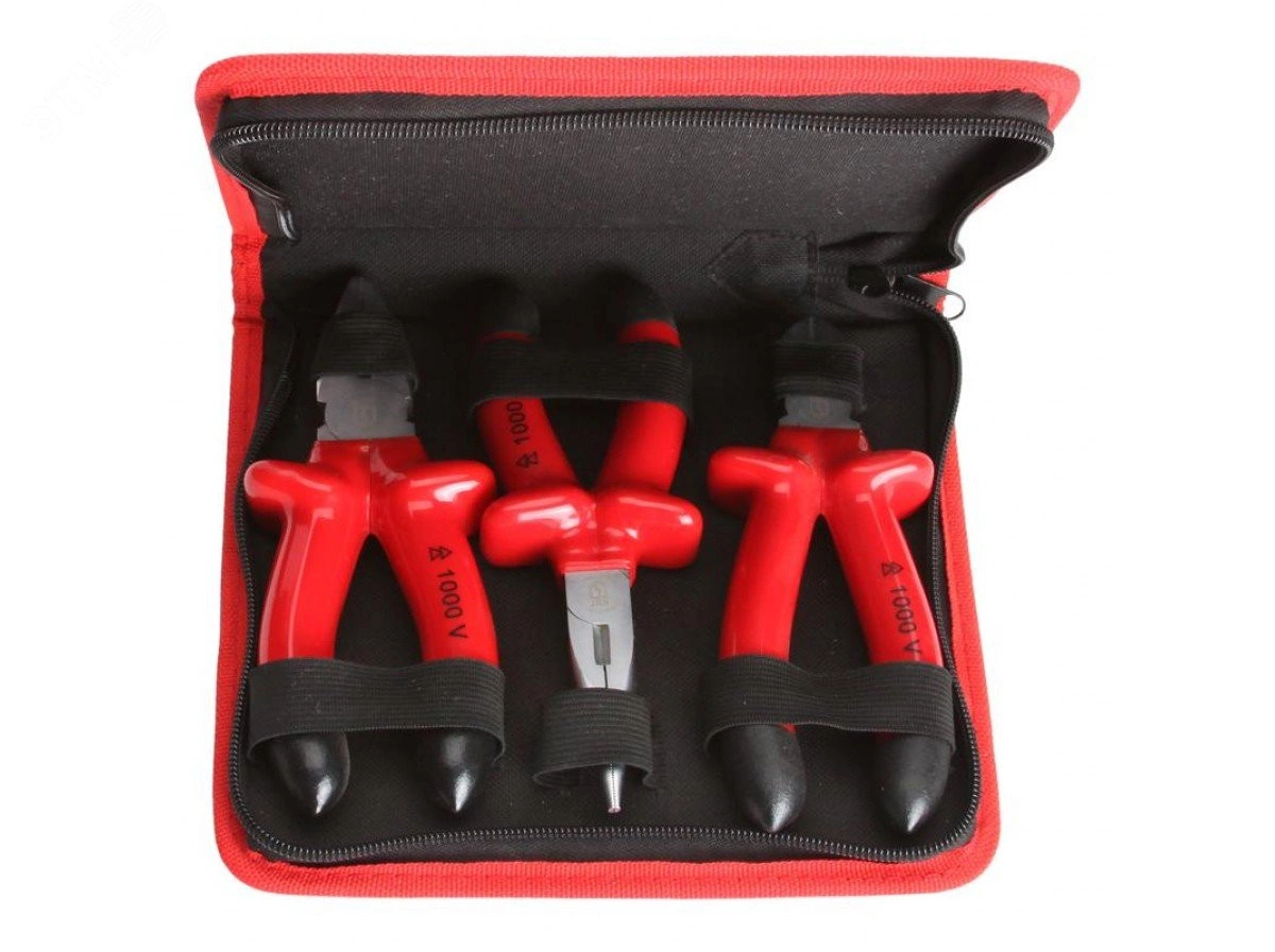 Для работы под напряжением до 1000 В. Состав набора - диэлектрические бокорезы 160 мм, диэлектрические пассатижи 160 мм, диэлектрические длинногубцы 160 мм Дополнительная индукционная закалка режущих кромок. Твердость HRC 60. Материал рабочей части - хром-ванадиевая сталь. Обработка поверхности - матовое никелирование. Материал рукояток - двухслойная диэлектрическая пластизоль. Внутренняя изоляция – желтого цвета, внешний слой изоляции – красного цвета. Упаковка - тканевый водозащитный кофр. Габариты упаковки - 205x185x40 мм. Вес набора - 830 г